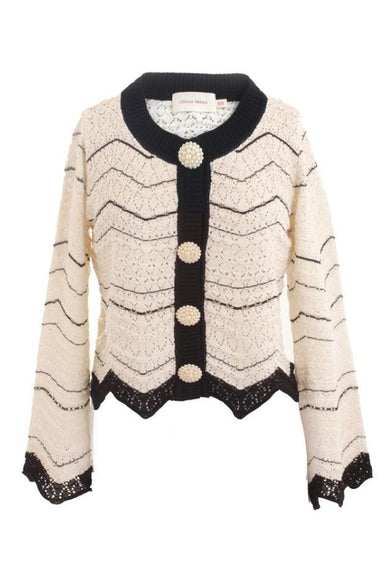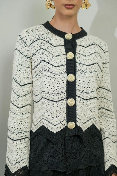 DETAILS Full snap front cardigan Black and white chevron pattern Pointelle stitching Wide sleeves Ribbed yoke Handmade pearl decorative buttons Fi...