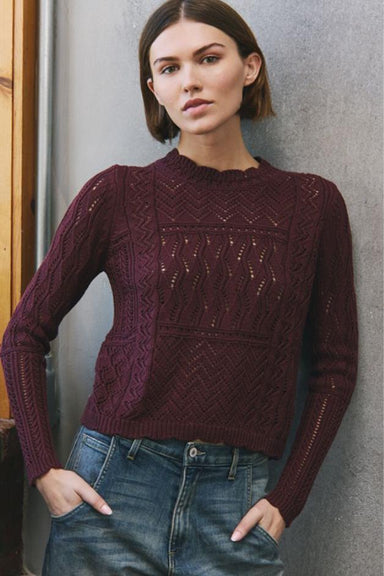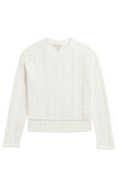 *Cotton by Autumn Cashmere* DETAILS Crewneck pullover Long sleeves Rib neck, cuff, hem with scalloped edge Allover pointelle stitching FIT T...