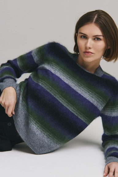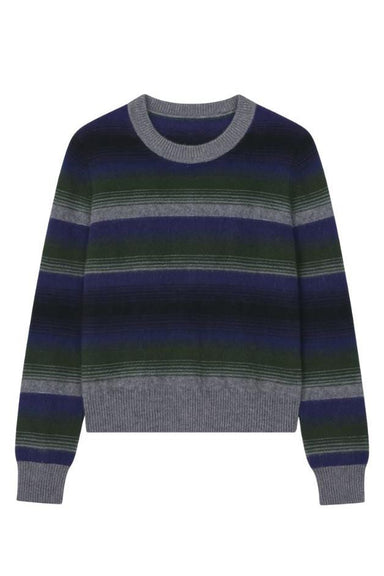 DETAILS Crewneck pullover Ribbed neck Shirttail hem Fine gauge cashmere Engineered stripes FIT True to size Size S - Chest 20" Body length 24...