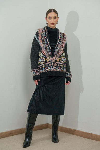 DETAILS Shawl collar with fringe detail Deep V neck Long sleeves with border trim Allover jacquard knit FIT XS= EU 34/ US 4 S = EU 36/ US 6 M = ...