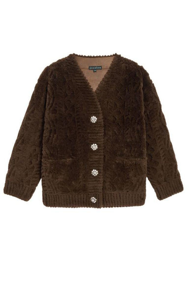 DETAILS V Neck Button front Pockets All over cable pattern Sheared sherpa Glass crystal buttons Rib hem and cuff FIT Meant to be OVERSIZED We s...
