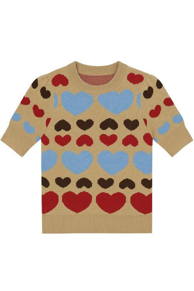 DETAILS Puff sleeve Crew neck Short sleeve Ribbed hems Multi colored heart prints FIT True to size XS - chest 17 1/2" length 21 1/2" S - che...