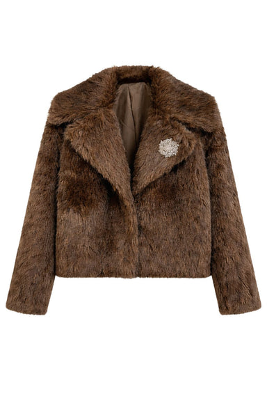 ****Available for shipping 1/15**** DETAILS Faux fur Long sleeves Classic notch collar 2 button snap front Removable rhinestone brooch pin Pock...