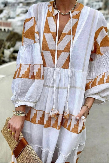 DETAILS Ruffled neckline Puff sleeve with elastic cuff Screen-printed by hand. Fully lined. Side seam pockets. Gently fitted at the waist Maxi le...