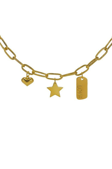 DETAILS Mini paperclip chain 3 fixed charms- LOVE tag Star Puffed heart Lobster clasp Adjustable length 16"-18" 18K gold plated over 925 sterlin...