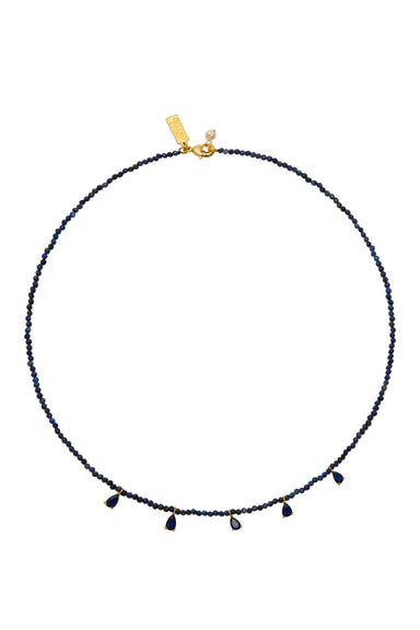 DETAILS Lapis beads Navy 5A graded cubic zirconia Lobster clasp with freshwater pearl accent Approximately 17" long Linen drawstring pouch include...